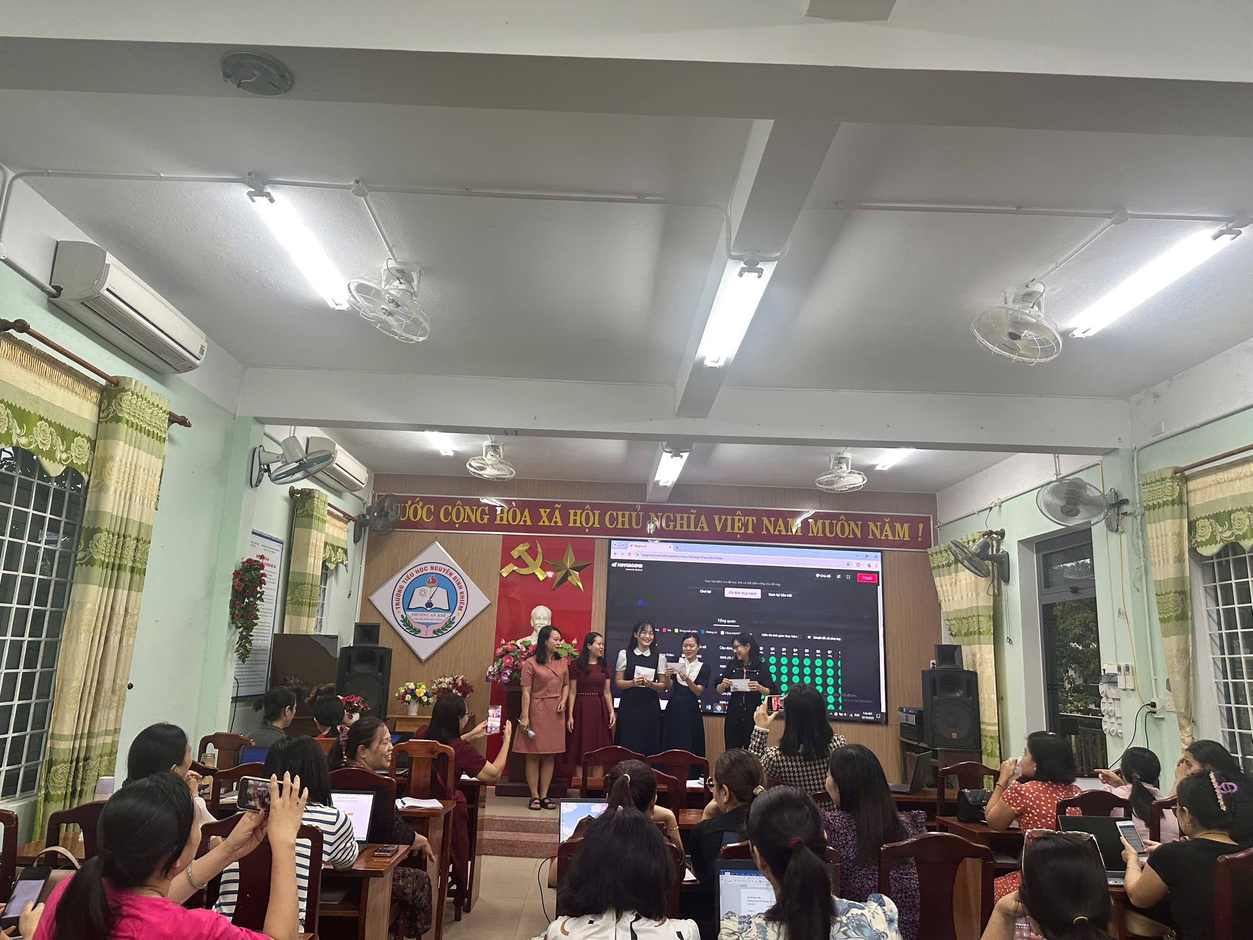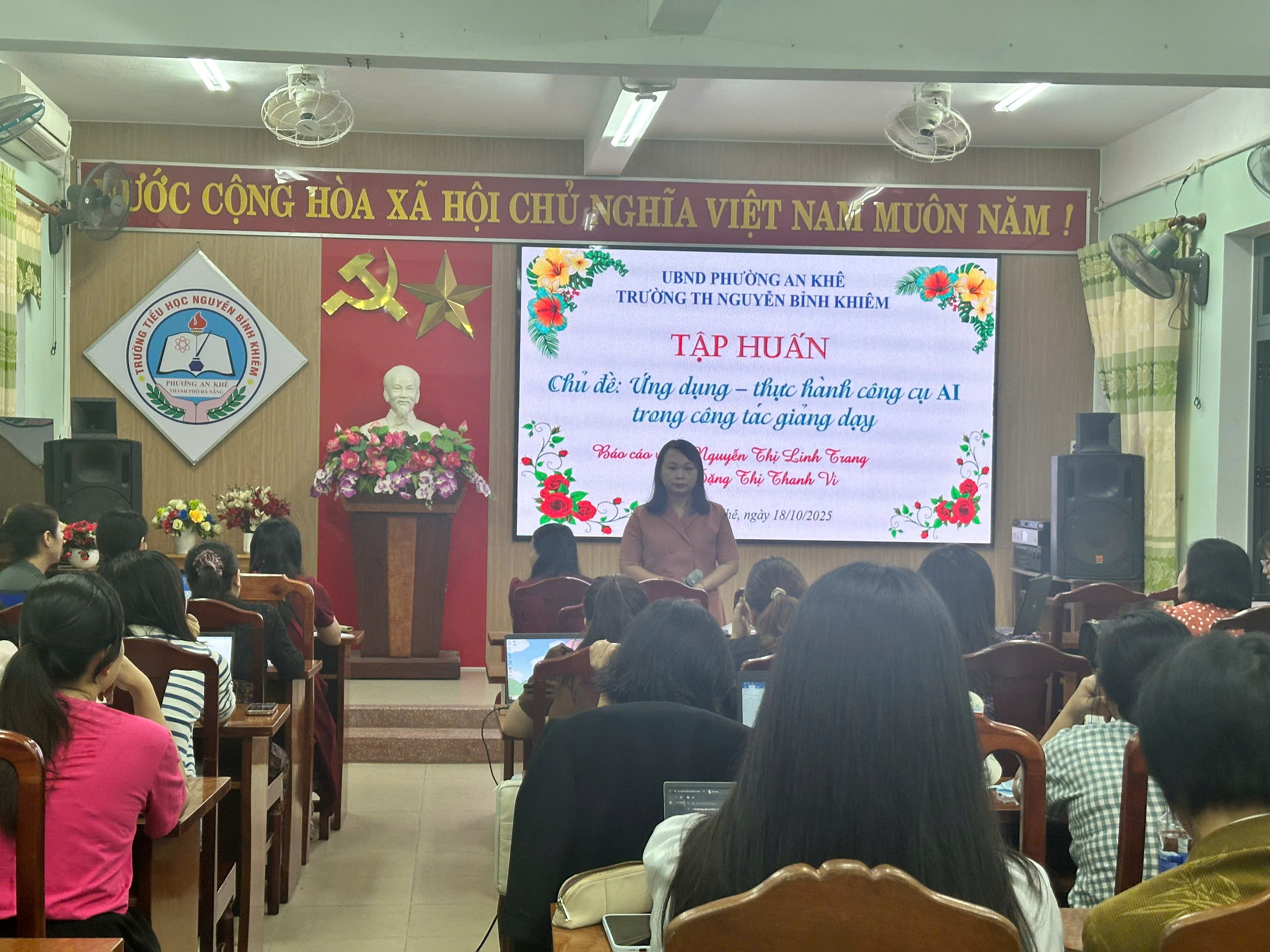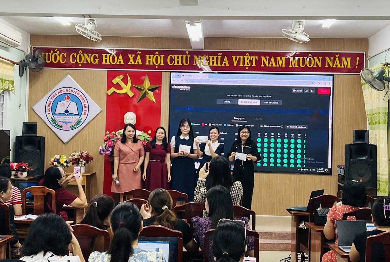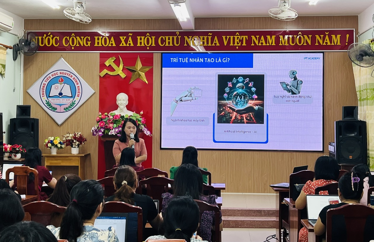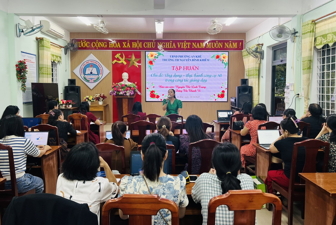Sáng ngày 18/10/2025 hội đồng sư phạm trường TH Nguyễn Bỉnh khiêm tổ chức tập huấn Ứng dụng – thực hành công cụ AI trong công tác giảng dạy, nhằm trang bị kiến thức và kỹ năng cho giáo viên, giúp họ ứng dụng trí tuệ nhân tạo để đổi mới phương pháp dạy học, nâng cao chất lượng giáo dục và giảm bớt gánh nặng công việc hành chính. Buổi tập huấn giúp giáo viên khai thác tiềm năng của AI trong việc cá nhân hóa lộ trình học tập, tự động hóa việc chấm điểm, và tạo ra nội dung giảng dạy sáng tạo hơn.