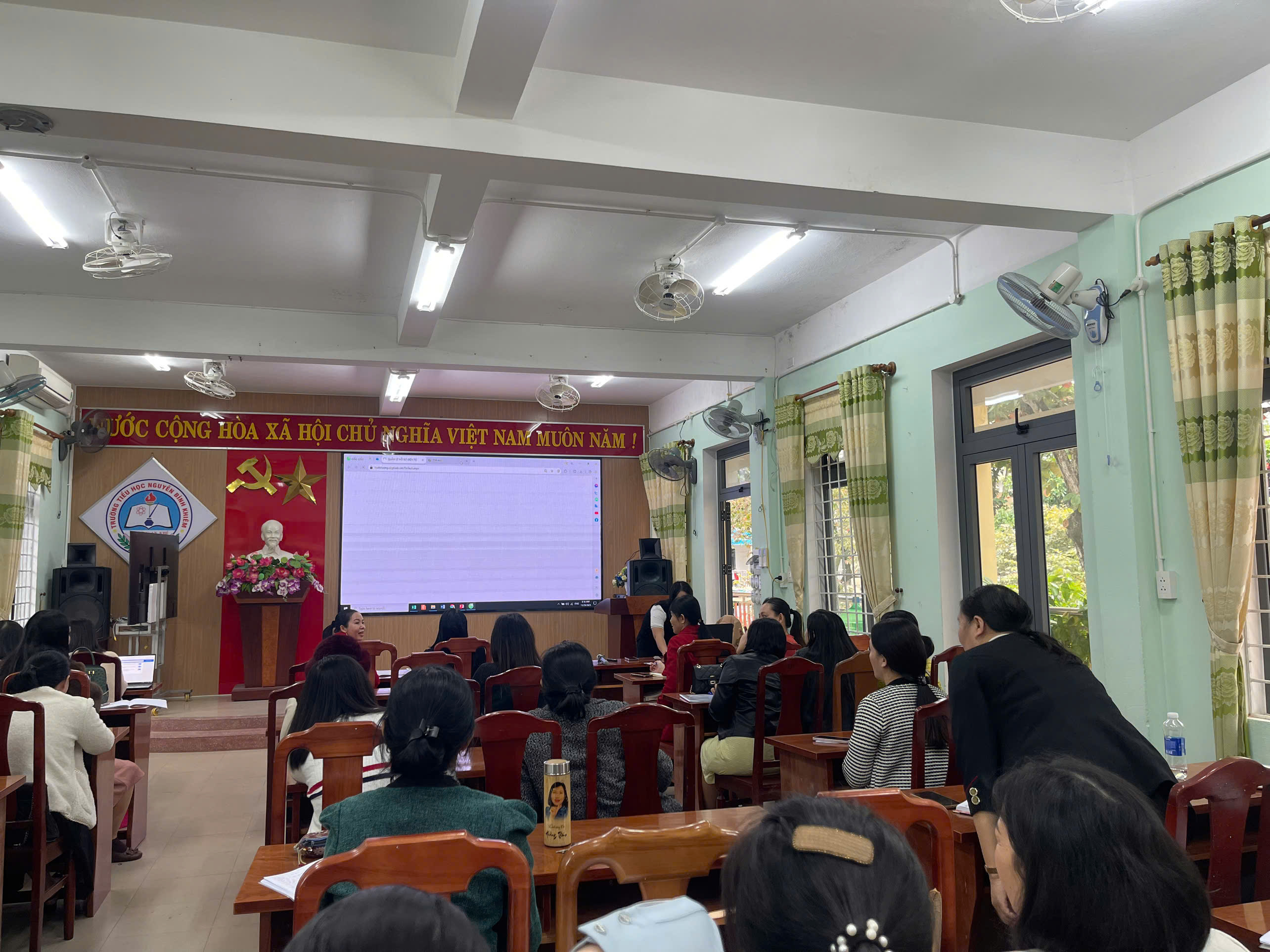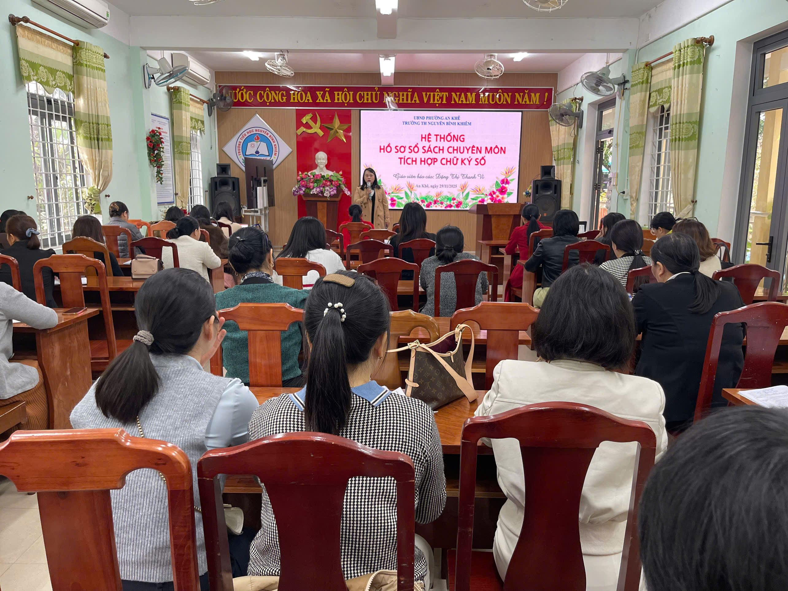 Sáng ngày 29/11/2025, tại trường TH Nguyễn Bỉnh Khiêm, buổi tập huấn hồ sơ sổ sách trên cơ sở dữ liệu ngành giáo dục đã diễn ra nghiêm túc và hiệu quả. Giáo viên được hướng dẫn cách cập nhật thông tin, quản lý hồ sơ, cũng như sử dụng các chức năng mới của hệ thống. Buổi tập huấn giúp đội ngũ giáo viên nắm vững quy trình thao tác, đảm bảo dữ liệu được quản lý thống nhất và chính xác. Nhờ đó, công tác hành chính – chuyên môn của nhà trường sẽ trở nên thuận lợi, khoa học và hiện đại hơn trong thời gian tới.